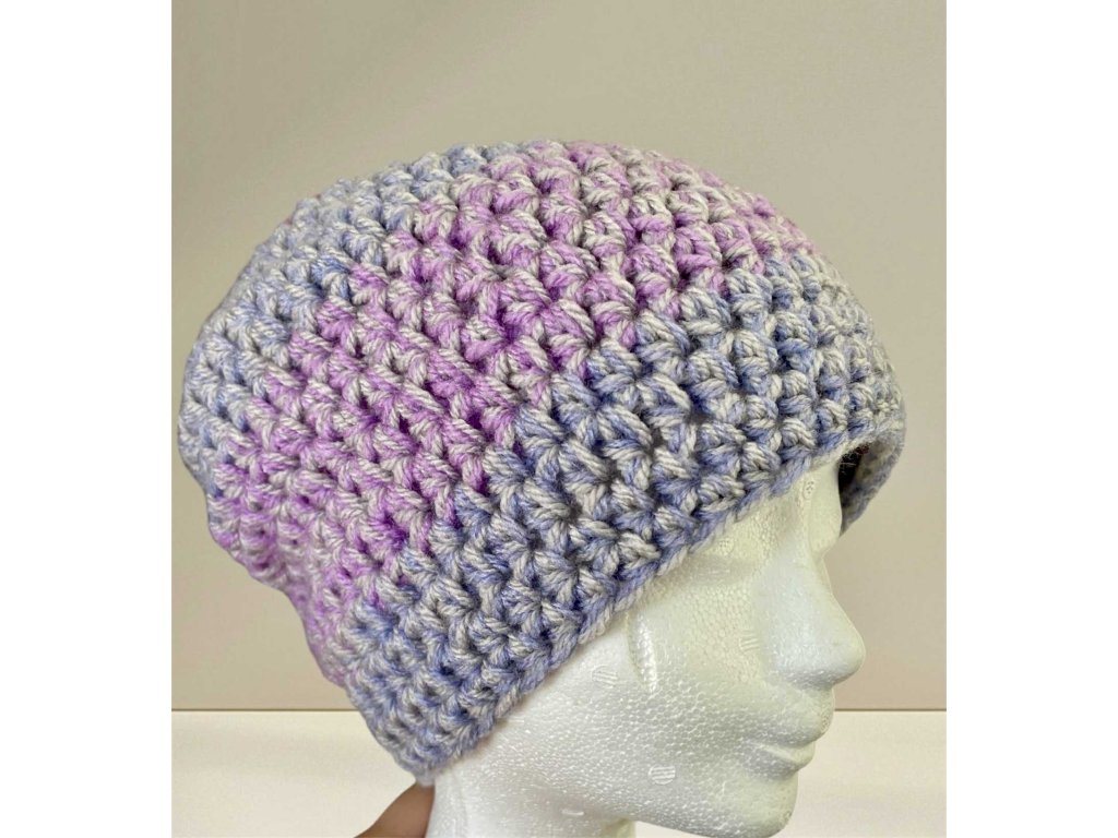 Je ručně háčkovaná z měkké příze s jemným barevným přechodem od světle fialové po růžovou.